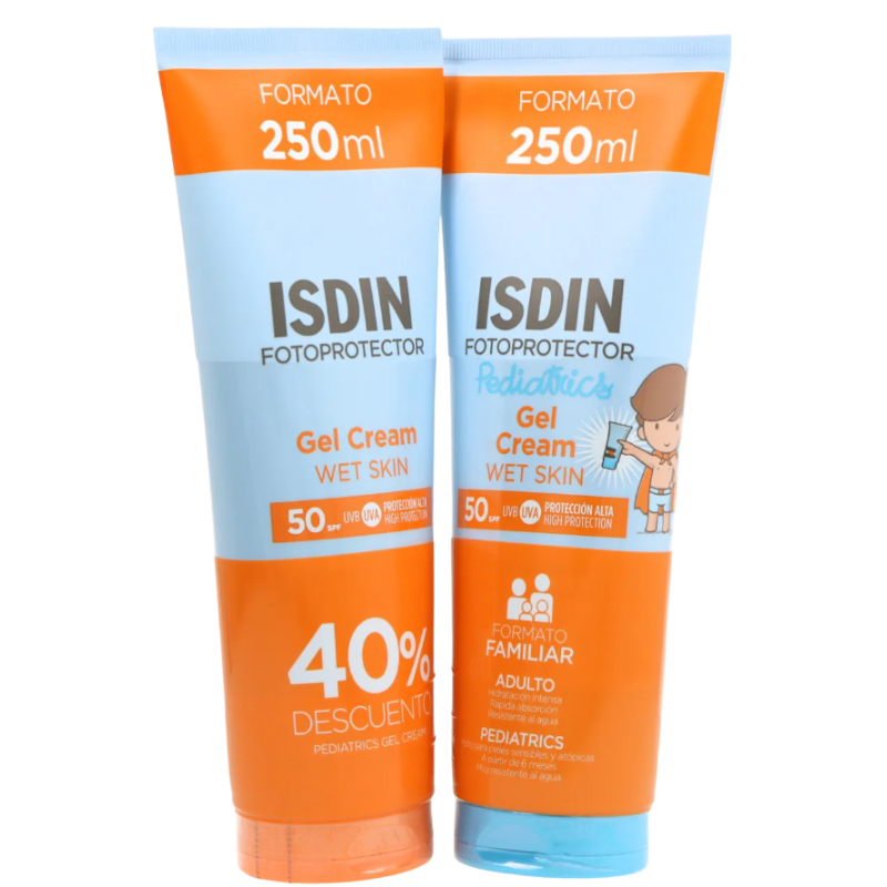 El pack ISDIN Gel Cream + Gel Cream Pediatrics SPF 50 ofrece protección solar de amplio espectro UVA/UVB con textura gel-crema. El Gel Cream está pensado para uso en toda la familia —adultos y niños—, aportando hidratación con textura fresca y de rápida absorción; mientras que la versión Pediatrics está especialmente formulada para piel delicada de bebés y niños (a partir de 6 meses), con un acabado suave, sedoso y sin brillos. Ambos ayudan a prevenir quemaduras solares, fotoenvejecimiento y daño solar, al tiempo que mantienen la piel hidratada y protegida bajo el sol. :contentReference[oaicite:1]{index=1}