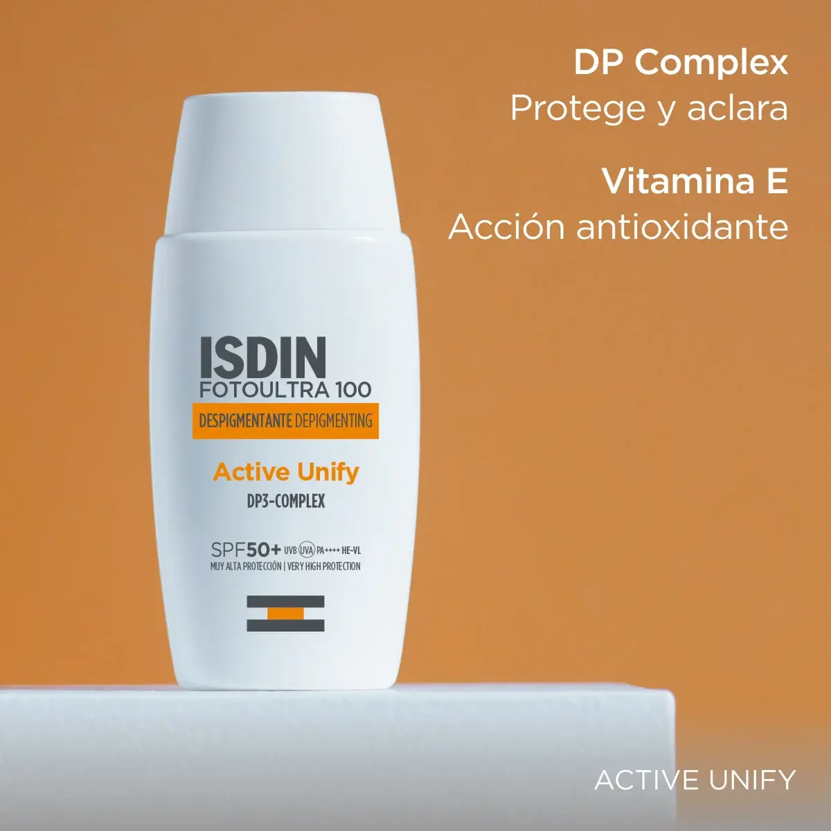 ISDIN FotoUltra 100 Active Unify es un fotoprotector facial formulado específicamente para ayudar a prevenir y corregir las hiperpigmentaciones solares. Proporciona muy alta protección frente a la radiación UVA y UVB y contribuye a unificar el tono de la piel con el uso continuado. Está indicado para pieles con tendencia a manchas, hiperpigmentación o que requieran una fotoprotección muy elevada como parte de su cuidado diario. Información adicional detallada no especificada en la web oficial.