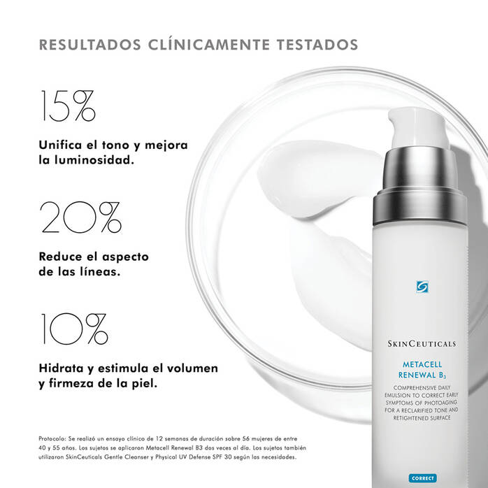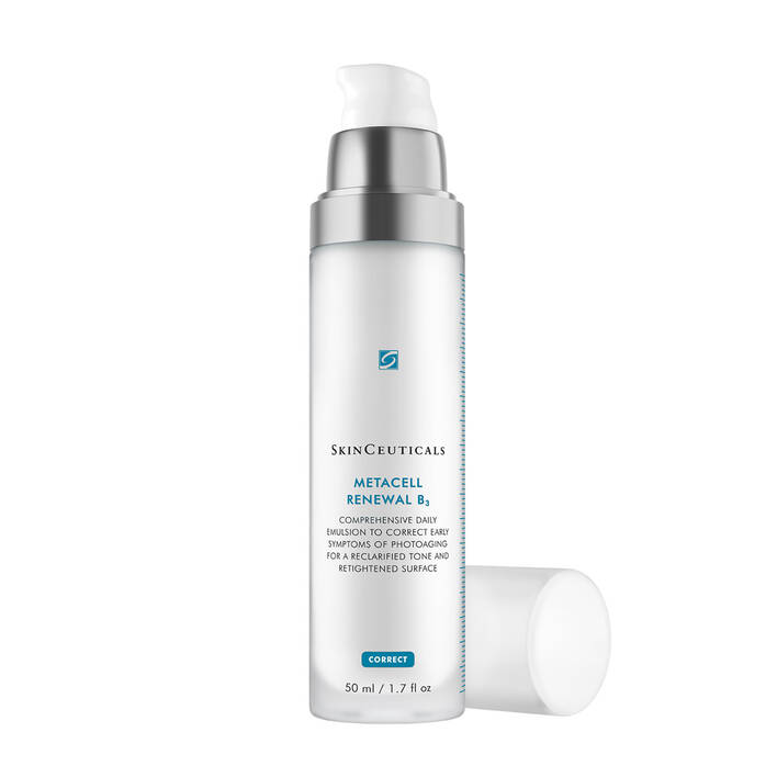 SkinCeuticals Metacell Renewal B3 es una emulsión facial correctora formulada para tratar los primeros signos visibles del envejecimiento cutáneo. Ayuda a mejorar la apariencia de líneas finas, la textura irregular y el tono apagado, al tiempo que refuerza la hidratación y la función barrera de la piel. Su textura ligera y de rápida absorción la hace adecuada para el uso diario en todo tipo de pieles, incluidas las sensibles. Información adicional detallada no especificada en la web oficial.